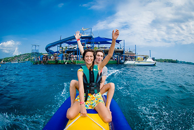 À l’arrivée, nous jeterons l’ancre près de notre ponton privé spécialement conçu, qui vous attend avec une multitude d’activités : profitez de tours illimités en bouée banane, d’un spectaculaire toboggan aquatique de 35 mètres, et bien plus encore. Cette excursion d’une journée à Lembongan vous offre aussi la chance de découvrir la vie marine fascinante de l'île grâce à nos sorties de plongée guidées par des instructeurs certifiés PADI.
